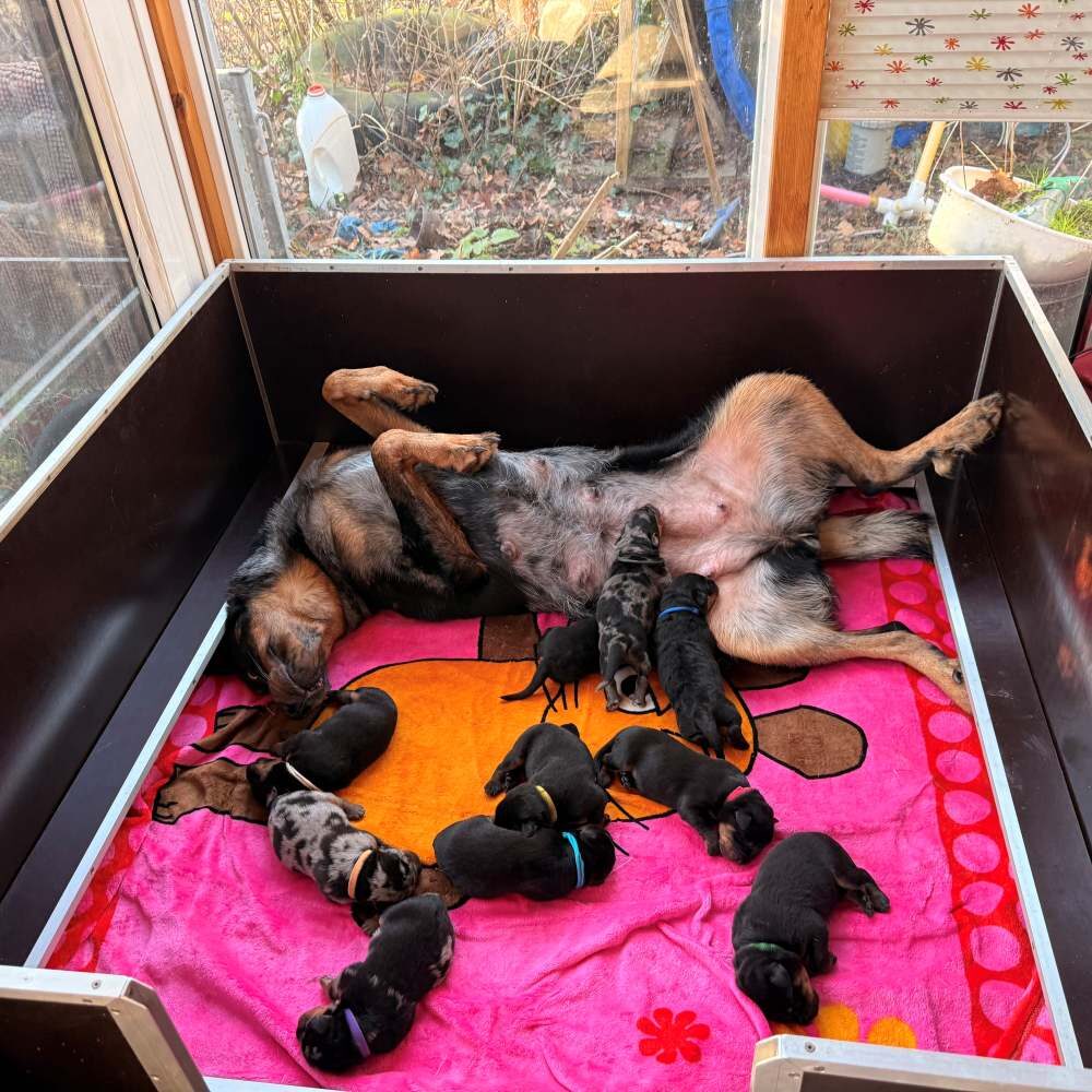 Am 20.12.2025 ist unser A Wurf geboren. Unsere Dakota hat uns am 20.12 in nicht mal 5 Stunden 11 Welpen geschenkt. Eine Hündin hat dann aber leider die ersten 24 Stunden nicht überlebt. Sie strahlt jetzt als Stern am Himmel.